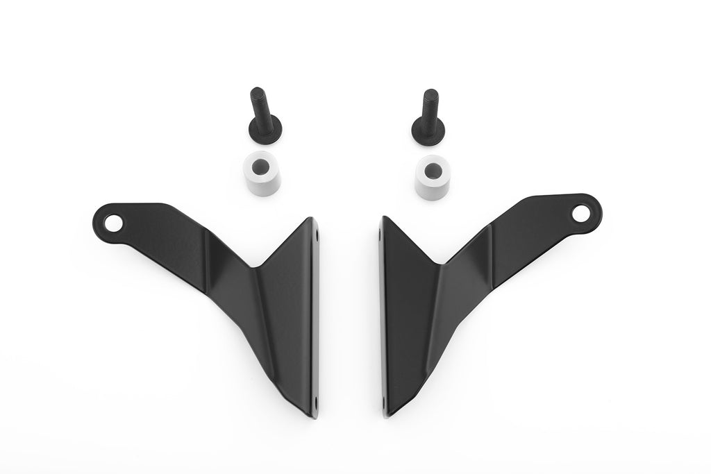 The rigid windshield reinforcement is attached between the original windshield mount and the windshield itself, and additionally bolted to the headlight mount on the side. This reinforces and supports the original mount to minimize high wind pressures, windshield vibrations, and the risk of resulting vibration cracks.