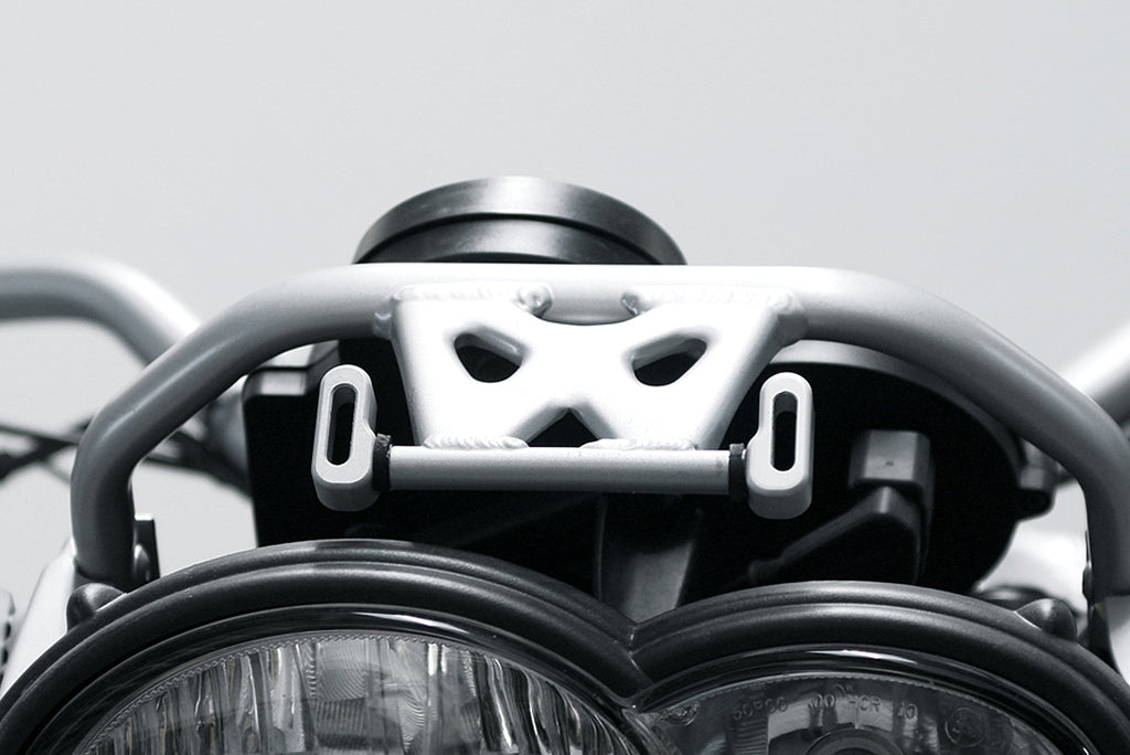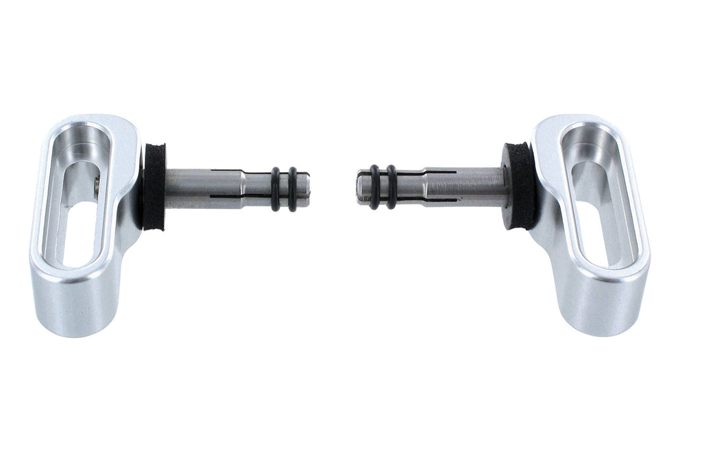 A strong and robust replacement for the original plastic centre windshield mounts. With these machined aluminium brackets the windshield is now connected strongly to the metal bracket, which also reduces the side to side movement of the windshield. Additionally, a 20 mm (~13/16“) slot has been added, allowing the gap between the windshield and instruments to be adjusted. This helps the rider to find the best setting for the air flow from the inside of the windshield to equalize the negative pressure and reduce turbulence and buffeting. It also increases the overall adjustment range of the windshield. Both sides are connected with a threaded rod, allowing them to be adjusted so that no side clearance to the metal bracket is present. The adjustment of a slight side pressure on the metal bracket makes sure that the windshield cannot move sideways any more and the rattling and vibrating is reduced. The overall stability of the windshield is greatly enhanced compared to the loosely fitting original plastic brackets.
