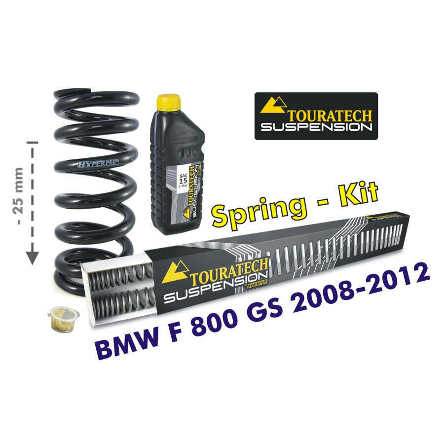 The height lowering kit by Touratech Suspension, from the Dutch specialist Hyperpro. The set includes replacement fork springs and a replacement spring for the shock absorber. This spring set provides you with a sensible 25mm reduction in height without affecting the riding properties - at the expense of a little ground clearance. The progressive springs have been designed to match the BMW F800GS perfectly, and offer a tremendous improvement in response and greater safety in extreme situations. Replacing the front and rear springs will lead to a significant improvement in your suspension system.