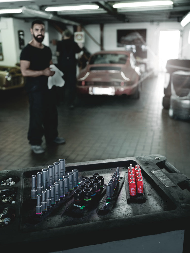Socket rail with 6 long manual and machine sockets (non-impact), 1/2"". A smooth rotary mechanism allows a secure hold and easy access of the sockets. Long 1/2"" manual and machine sockets (ISO 2725 part 3) by Wera for manual and (non-impact) machine use even at low lying couplings and protruding thread rods. With Take it easy tool finder with colour coding by size - to help you find the required tool quickly and easily. Slip-proof for easy grip even with oily hands. With hexagon profile and ball stop groove. The hexagon profile enables the transmission of high forces and loads the edges of the bolt or the screw head less than a double hexagon profile. Fine-teethed ratchets also make use of a double hexagon profile superfluous, even in confined spaces, thanks to their small return angle. For external hexagon bolts and screws. The rail allows temporary attachment to metallic surfaces and, with its twist-to-unlock function, ensures secure locking and unlocking of the sockets.